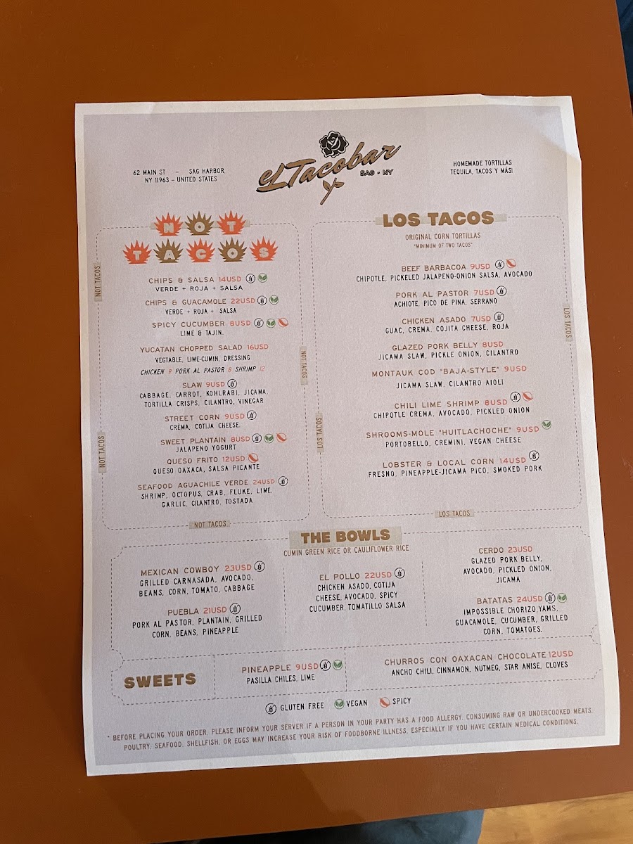 At Eltacobar Menu, the vibrant flavors of Mexico come alive right in the heart of Sag Harbor. Nestled on Main Street, this cozy spot offers a delightful mix of traditional Mexican dishes and bold, creative twists. Whether you're in the mood for sizzling fajitas, tender tacos, or the rich taste of homemade guacamole, there's something for everyone. The menu showcases an array of flavorful options, from zesty carnitas to perfectly grilled seafood. Every dish is made with fresh, high-quality ingredients, ensuring a memorable dining experience. Pair your meal with a refreshing margarita or a craft beer for the perfect finish.